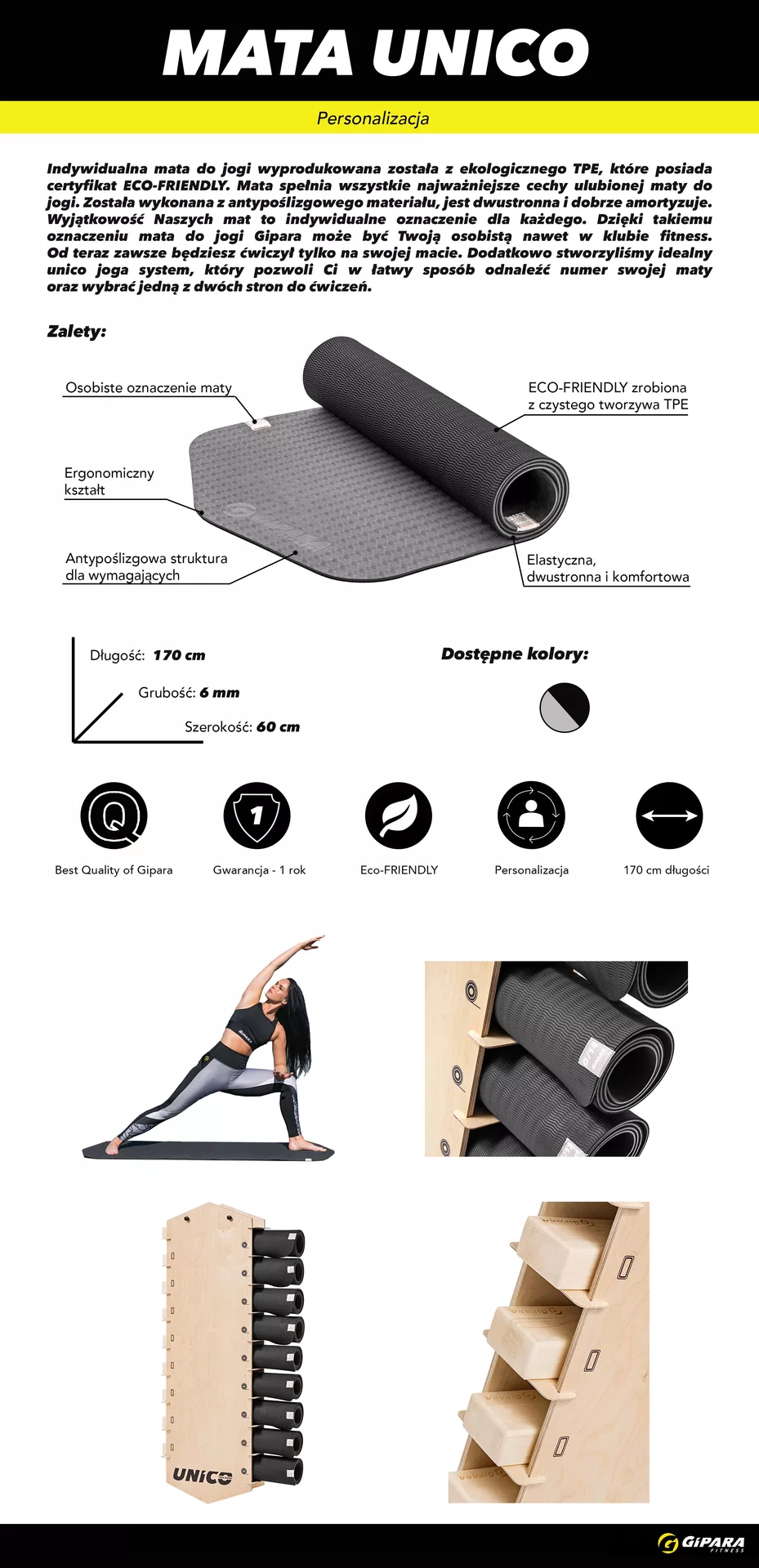 Mata do jogi Unico to funkcjonalna, dwuwarstwowa mata treningowa, a żadne ćwiczenie jogi nie jest kompletne bez dobrej maty. W trosce o środowisko stworzyliśmy ekologiczną matę z biodegradowalnego tworzywa TPE z certyfikatem Eco-Friendly.Doskonałe właściwości materiałów, z których jest wykonana zapewniają komfortowe, bezpieczne i stabilne wykonywanie ćwiczeń. Nawet w najtrudniejszych pozycjach stopy lub dłonie nie będą się ślizgać, dzięki czemu uprawianie jogi będzie jeszcze przyjemniejsze.Dzięki numerycznym oznaczeniom, maty do jogi można przypisać konkretnym ćwiczącym, sprawnie odłożyć je w kolejności oraz szybko ich odszukać.W naszej ofercie znajdują się także inne maty - mata z trzciny cukrowej (Ergo Eco) i krótkie maty fitness (Ergo).
